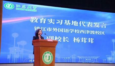 镇江市外国语学校西津渡校区副校长杨茸茸作为实习学校代表发言。她以校友身份寄语即将实习的学弟学妹,介绍了本校“双导师制”等安排,助力实习生夯实职业基础。